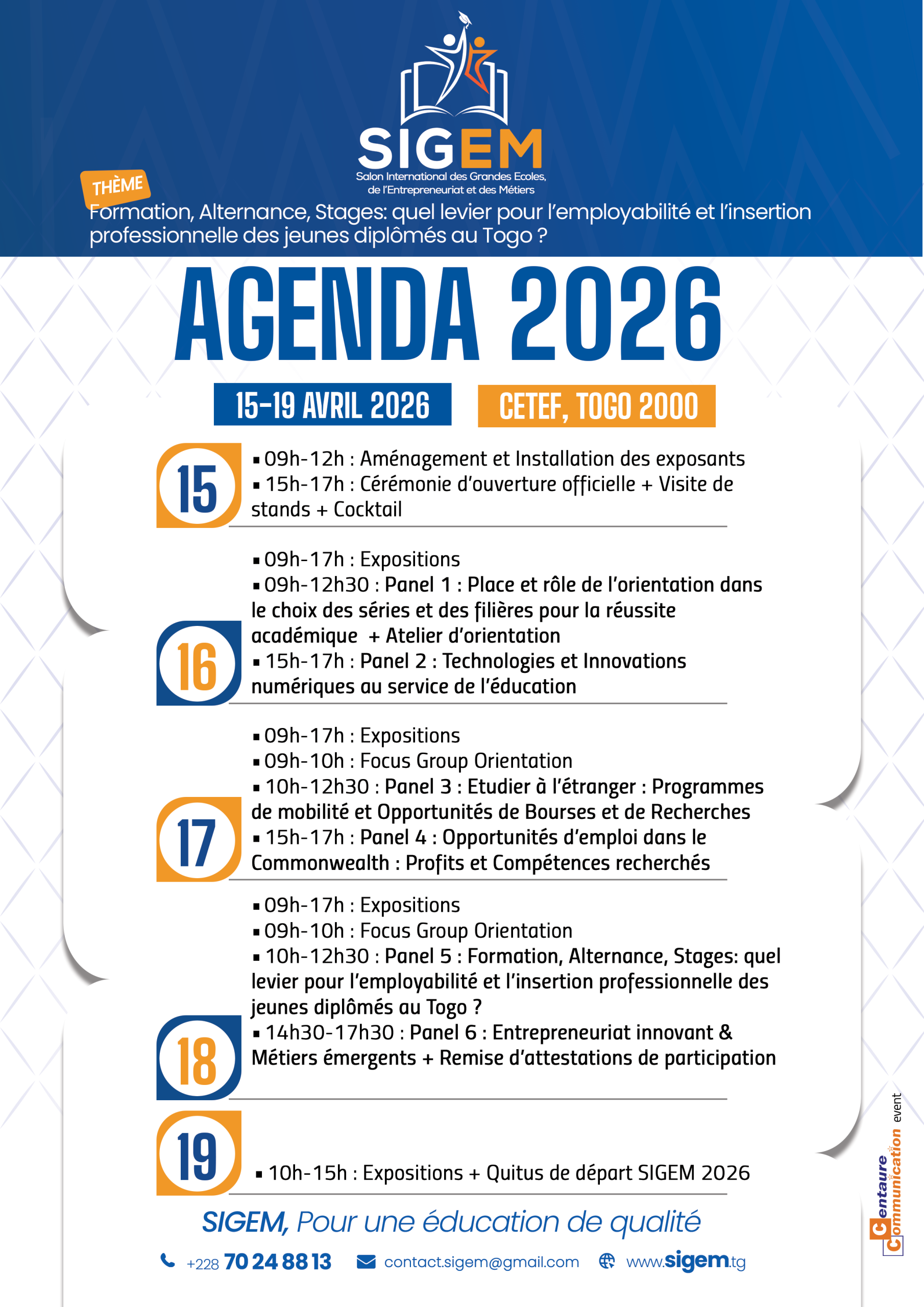 Le salon de l’étudiant, SIGEM est une plateforme dédiée aux offres de formation disponibles dans les universités publiques et privées, les écoles et instituts de BTS et les centres de formations professionnelles en faveur des étudiants , des bacheliers et des professionnels , un cadre d’information et de formation à l’entrepreneuriat et de promotion des métiers d’avenir.